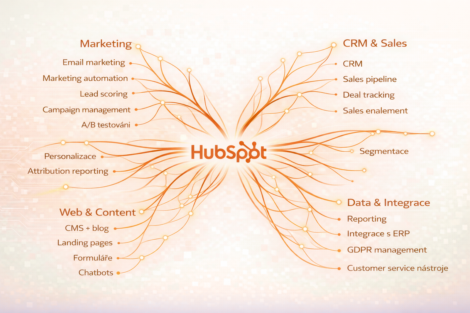 - HubSpot funguje jako backend pro práci s kontakty – CRM, marketingové automatizace, e-mailová komunikace a podpora obchodního týmu.